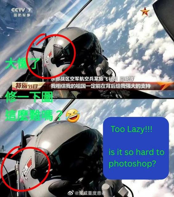 但周晓锋的头盔被网友发现,竟出现未经处理的电影《捍卫战士》(Top Gun)图徽,引发国际网友热议,甚至有人调侃“连中国自己都看不下去”、“太懒了吧!不修图吗?”