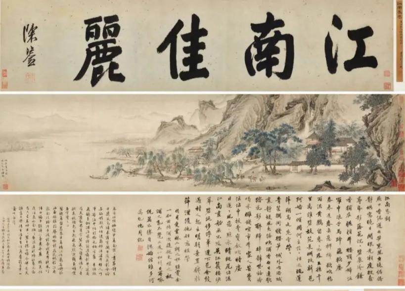 澎湃新闻在今年拍卖公司的明代仇英《江南春》图卷拍卖图录介绍上看到,“该画源于倪云林所作《江南春词》,因沈周先有唱和之作,同时吴门文人如文徵明、王宠、文彭、文嘉、王榖祥、彭年等皆迭相唱和,近日此卷终于现身于拍卖会,实乃艺林幸事。”“此图写山庄临水,周围翠竹掩映,松柏叠翠。二士夫骑马缓于绿柳板桥之间。远处桃李争艳,高阁临空,层峦叠起。江上画船往来,群骛齐飞,山色空濛,江南春早,宛然在目。画笔工细精到,山石作小斧劈皴,但习气恬雅,意境悠远。卷后有沈石田和倪云林词,文徵明、王宠、文彭、文嘉、王榖祥、袁表等八家复和之,文采与画境映发,诗意与书法争辉,各家藏印灿然夺目。”