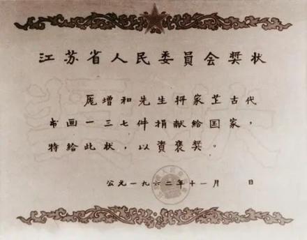 1962年11月,江苏省人民委员会颁发给庞家后人捐赠古代书画137件的奖状。