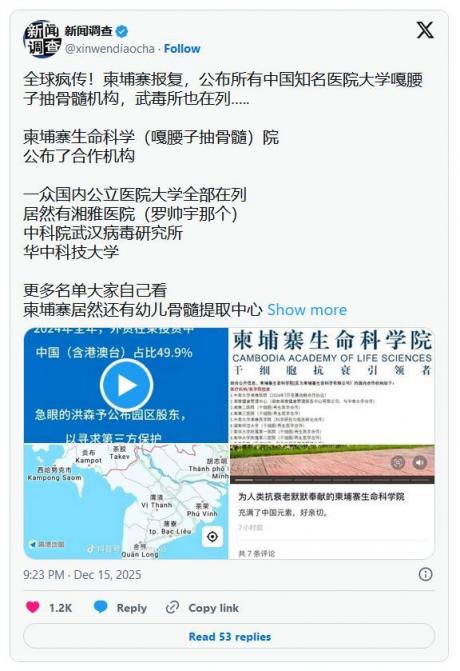 近日,泰柬冲突爆发后,泰国军队展开大规模清剿行动,许多中资赌场群、电诈窝点等被曝光。网传日前,进行活摘勾当的柬埔寨生命科学院公布了合作机构,许多中国公立医院和科研机构赫然在列。其中包括中南大学湘雅医院、湖南师范大学、中科院武汉病毒研究所等。
