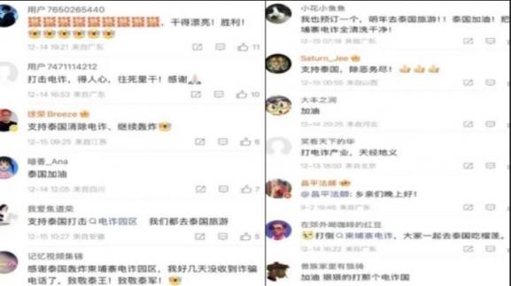 对此,大陆网友涌进泰国驻华大使馆官方微博下留言:“支持泰国打击电诈园区,我们都去泰国旅游”、“感谢泰国轰炸柬埔寨电诈园区,我好几天没收到诈骗电话了”、“泰国加油,把柬埔寨电诈园区全清洗干净!”、“有责任有担当的泰国令人仰视”、“遥远的东方有一条龙,他的名字叫泰国!”
