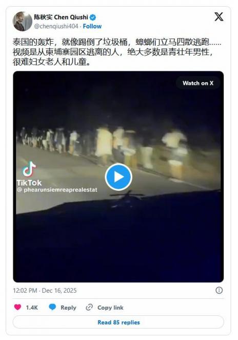 海外X网民也纷纷议论:“感谢泰国轰炸地狱国(中共)支持的魔窟”、“美国让泰国毁了中共在柬埔寨事业”、“中共三大运营商估计该下跌了”、“这不仅是对中国政府无能的公开打脸,更是对所谓‘大国崛起’最黑色幽默的注解”。