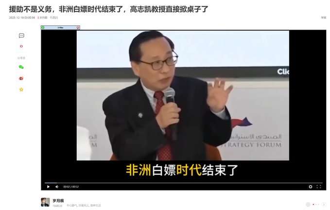 高志凯教授这次直接掀桌了,他直言道:非洲的白嫖时代必须结束!中国的援助不是义务!别再拿国际道义当挡箭牌了,更别把中国的善意当软弱! 中国对非洲的援助,从1956年就开始了,60多年里修铁路、建医院、打井、教技术,累计投入超千亿美元。但这些年,有些非洲国家慢慢变了味:一边享受着中国的无息贷款、技术援助,一边在联合国投票时跟着西方指责中国。有的国家拿了中国的钱修港口,转头就把经营权卖给美国,更过分的,甚至拿“中国债务陷阱”当借口,要求免除债务。中国不是慈善机构,援助的目的是共同发展,不是养懒汉!比如肯尼亚的蒙内铁路,中国不仅出钱修,还手把手教肯尼亚人开火车、修轨道,现在这条铁路每年为肯尼亚创造上亿美元收入,带动了沿线10万人就业。很多非洲国家今天还能维持最基本的工业、交通和电力体系,背后都有中国的影子。可问题是,善意给久了,就容易被当成理所当然。最让高教授生气的,是有些国家拿“国际道义”当挡箭牌。比如西方媒体总说“中国援助非洲是为了资源”,但数据打脸:中国从非洲进口的石油、矿产,只占中国总进口量的10%左右,反倒是非洲从中国进口的工业品、日用品icon占了大头。这哪是“掠夺资源”?分明是互利共赢。更气人的是,有些非洲国家一边享受着中国的援助,一边在涉疆、涉港问题上跟着西方抹黑中国。很多非洲国家今天还能维持最基本的工业、交通和电力体系,背后都有中国的影子。很多人喜欢把“国际道义”挂在嘴边,国际关系从来不是慈善机构。美国、欧洲对非洲的援助,哪一次不是附加政治条件?IMF、世行的贷款,哪一次不是要求结构改革、财政紧缩?真正“讲道义不讲回报”的,反而是中国。可恰恰因为中国长期强调“朋友”“兄弟”,反倒让一些人形成了错误预期。你不帮我,就是你不讲道义,你提条件,就是你变坏了,不再无条件付出,就是你“露出真面目了”。高志凯这次把话挑明,其实是在告诉对方一个现实:中国现在已经不是当年的中国了。中国纳税人的钱,首先要对中国人民负责,而不是无限制对外“输血”。更重要的一点是:援助如果没有对等责任,最后一定会变质。未来的中非合作,肯定会更务实、更注重效果。