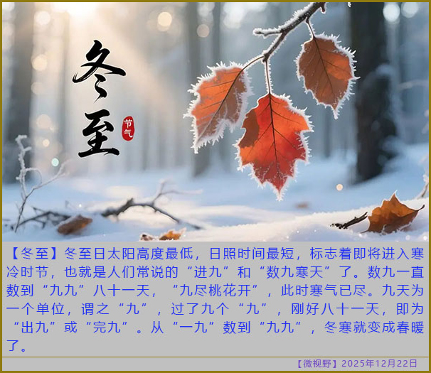 [微视野 2025/12/22] 冬至日标志着即将进入寒冷时节