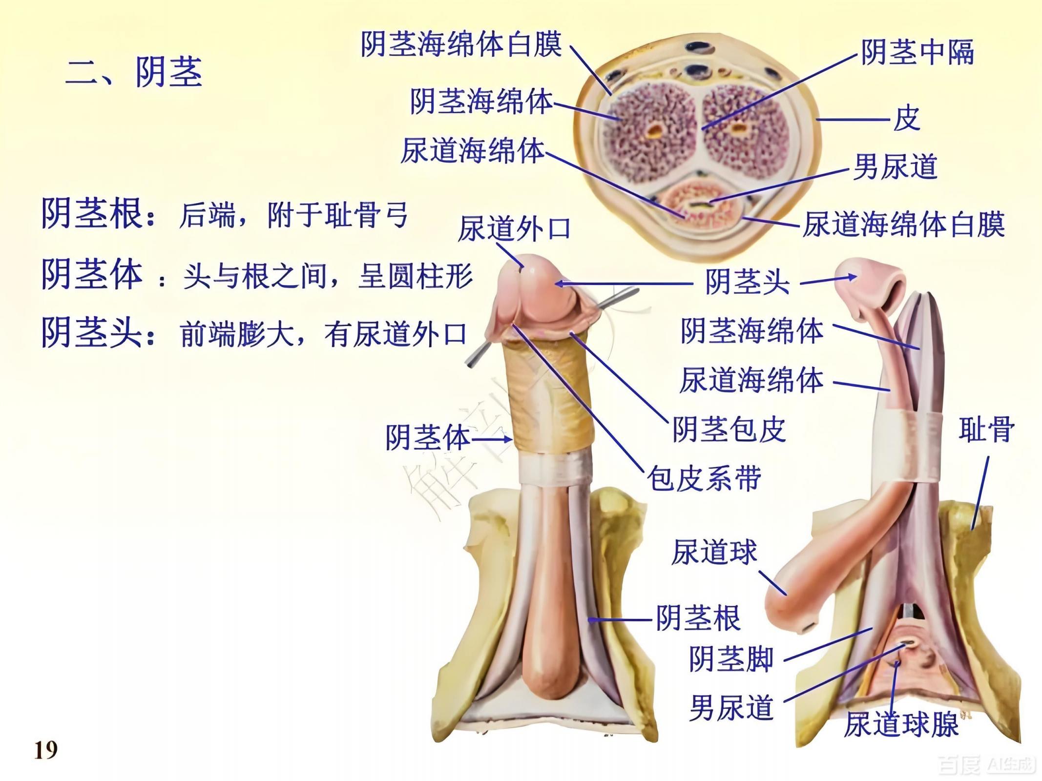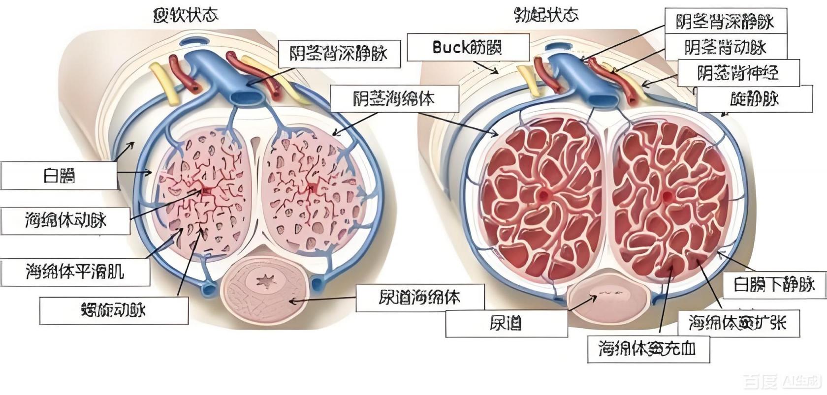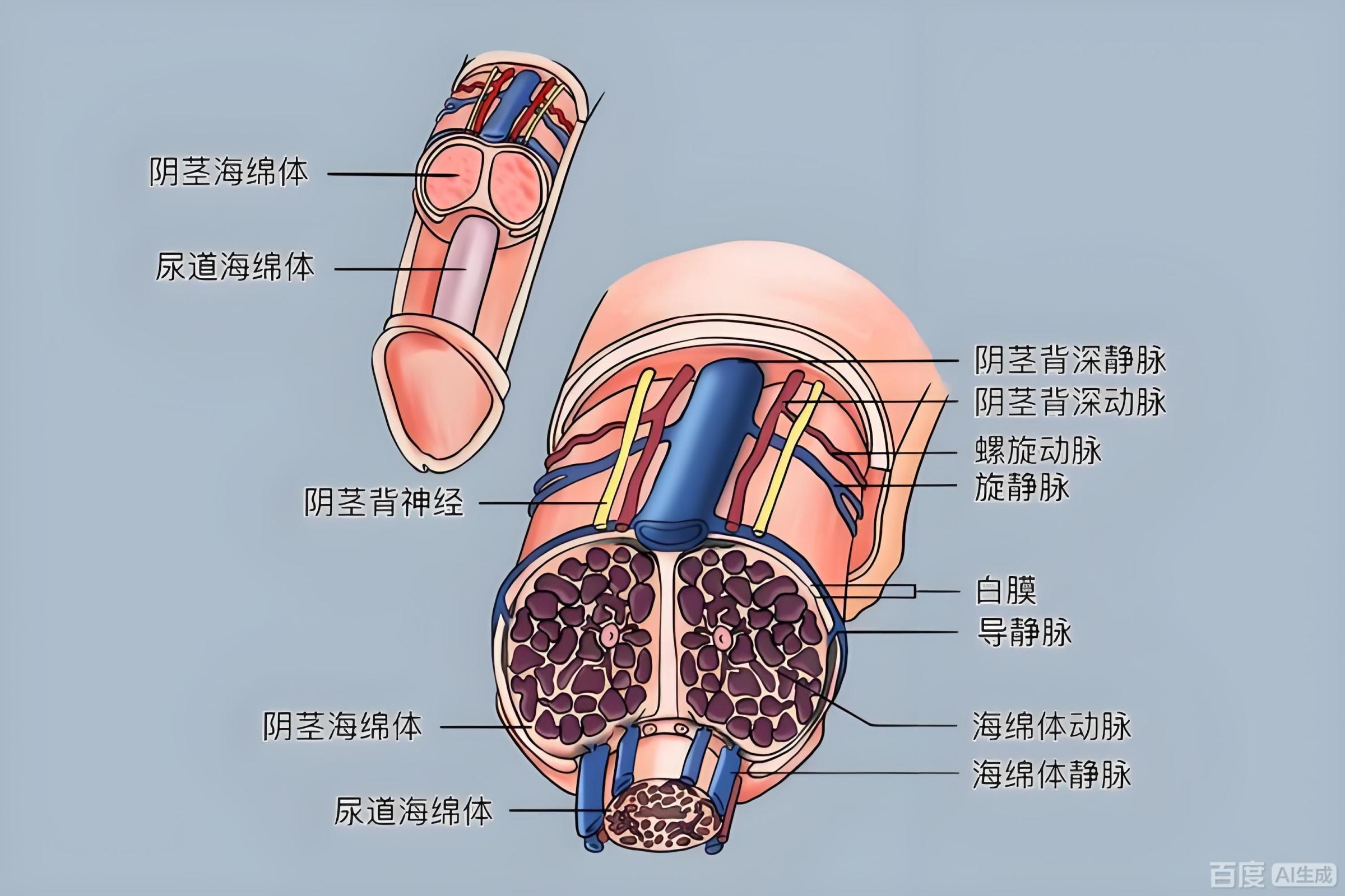从解剖学上来说您的阴茎分为三个室:两个大的部份是您的勃起肌,医学上称他们为阴茎主体。还有一个小的部份是您在小便和射精时起关键作用的,它在整个阴茎的底部,医学上称它为阴茎海绵体。当您有性的需求时,大脑会释放出性激素(荷尔蒙),它起到将大量的血液带入阴茎的作用。当这些血液突然涌入阴茎主体与海绵体内的细胞空间时,您的阴茎肌肉就勃起了。