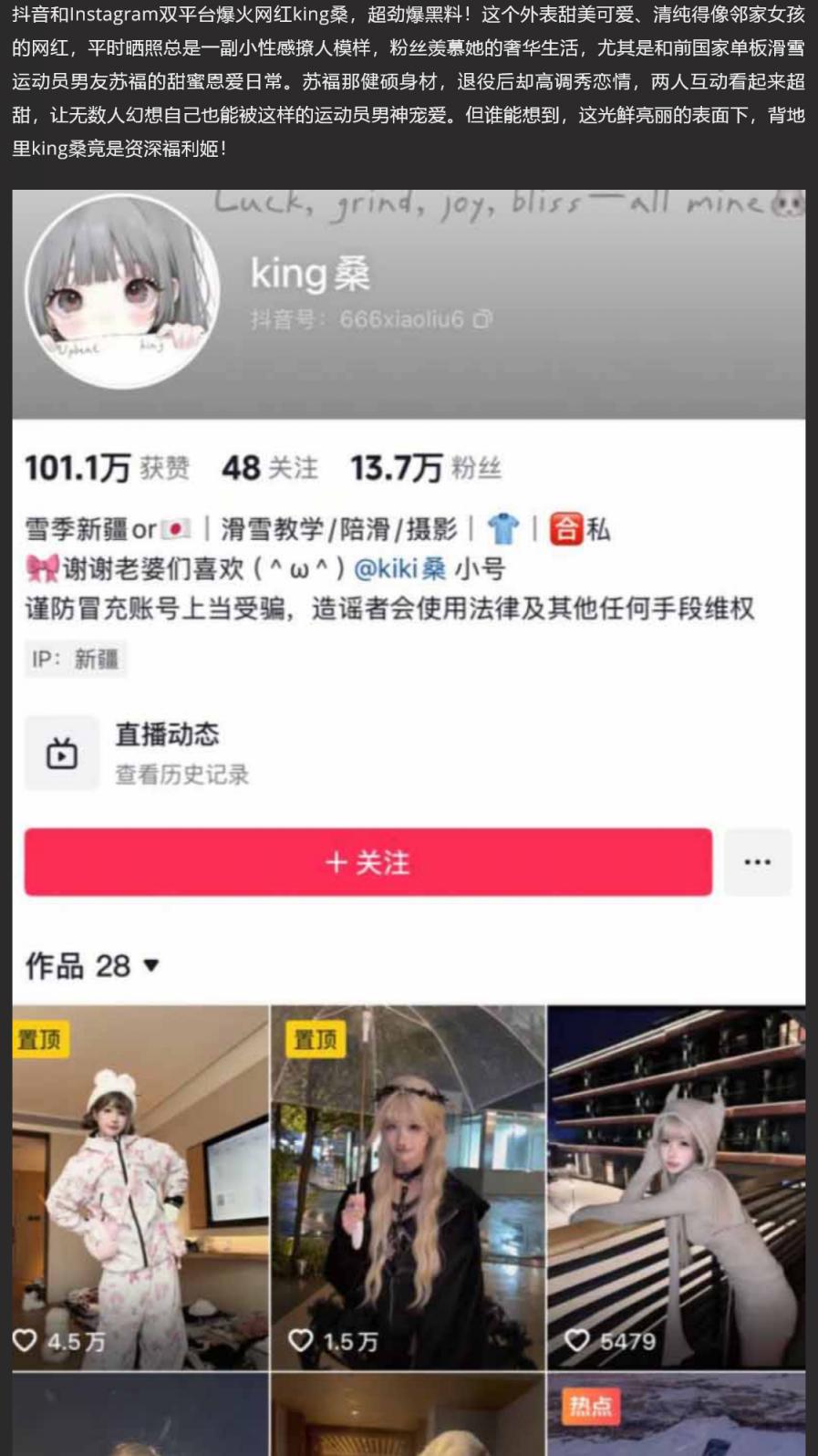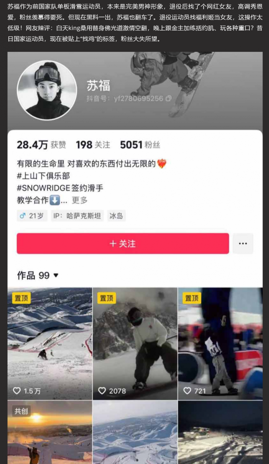 【2】❤️抖音清纯网红 king桑 滑雪后空翻遭打假 福利姬身份被一同曝光 前国家滑雪运动员男友苏福跟着塌房