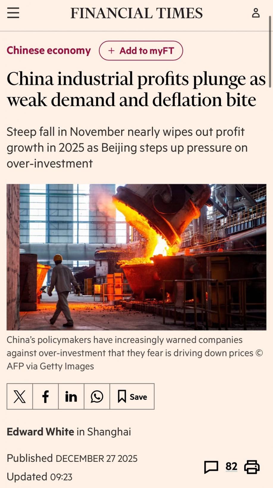 2025年11月份,规模以上工业企业利润同比陡然下降13.1%,创一年最大跌幅,几乎将2025年一整年的增幅抹去。
