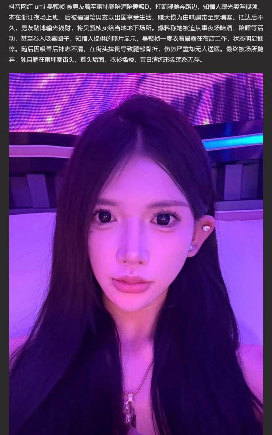 【5】❤️抖音网红 umi 吴甄桢 被男友骗至柬埔寨陪酒陪睡吸D 打断脚抛弃路边 知情人曝光卖淫视频