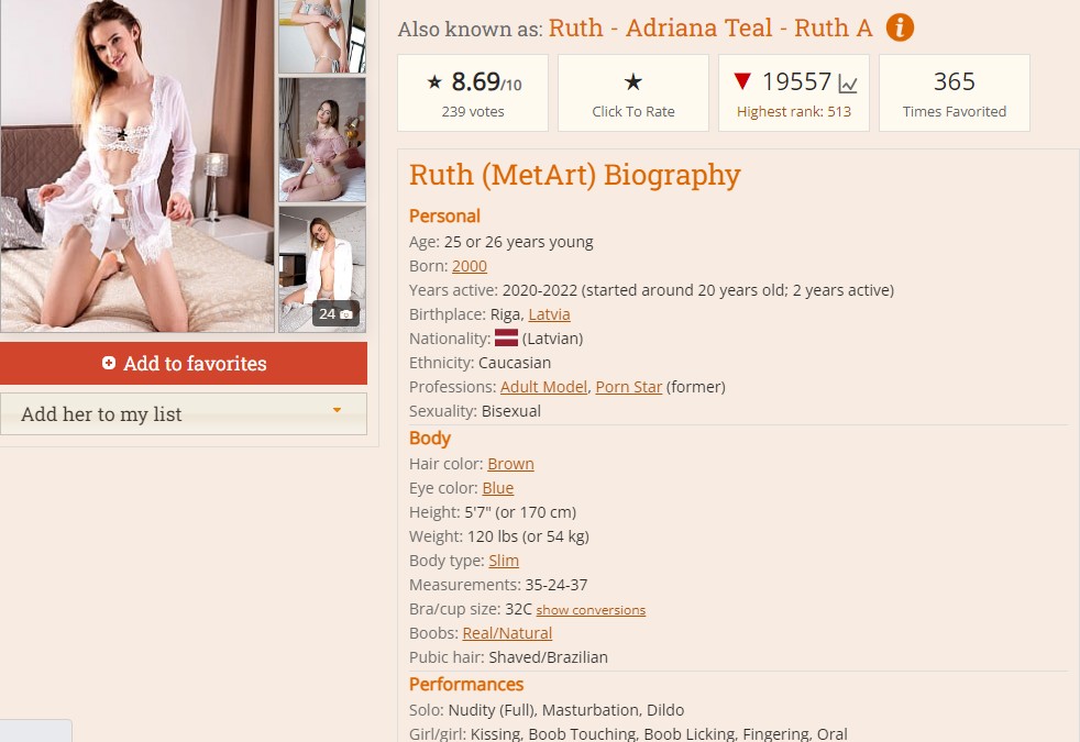 上图可见Adriana Teal出生于拉脱维亚的里加,应该是拉脱维亚人,但某些网站的资料却说她来自白俄罗斯或乌克兰,也有说她是瑞典人的,总之,这是一匹地道的欧罗巴高加索人种出品的洋马。