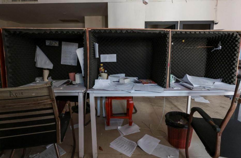 在柬埔寨边境小镇奥斯马(O’Smach)附近一个电诈园区,电诈劳工有自己的座位,每个座位铺好隔音棉,备妥不同的诈骗剧本。(路透社)